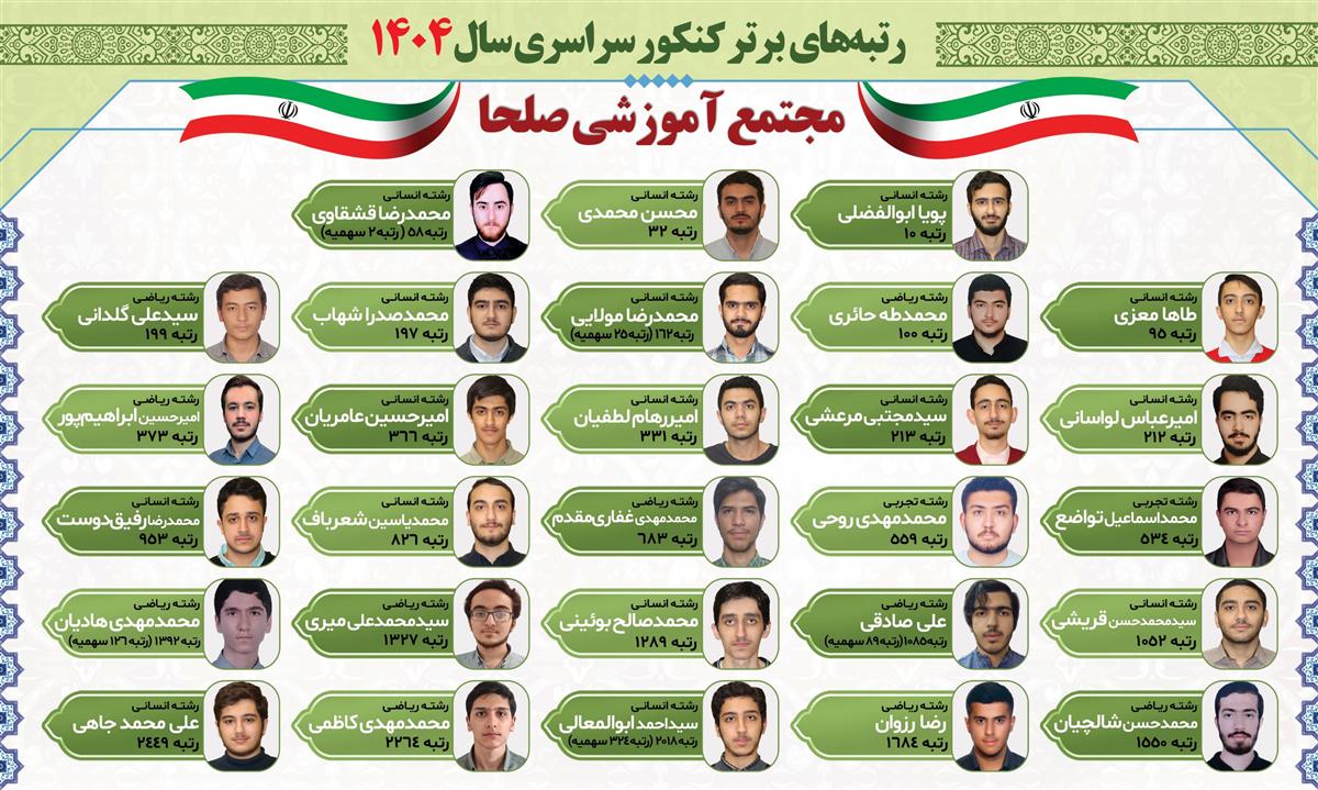 به فضل پروردگار متعال و زحمت دانش آموزان و اولیای گرامی و دبیران مجموعه فرهنگی صلحا نتیجه قبولی کنکور در سال تحصیلی گذشته به دست آمده است.در زیر به تفصیل، رشته ها و دانشگاه های این عزیزان قرار گرفته است.